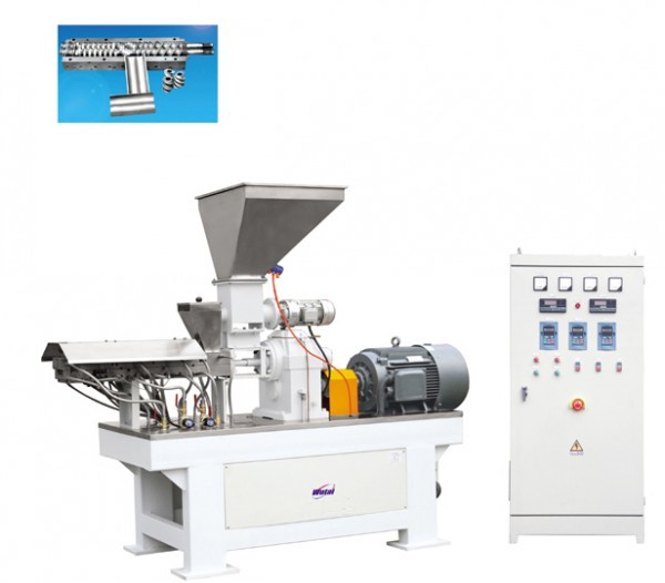 This machine is high speed twin screw extruder with special screw element design with two co-rotating screw shafts. ,high output capacity ,good wear resistance and exchangeable liners . The raw material in barrel is to be excellent dispersed and kneaded causing the screw elements and kneading blocks on the two shafts are precisely meshed together. This extruder is one ideal equipment for extruding various chemical materials.